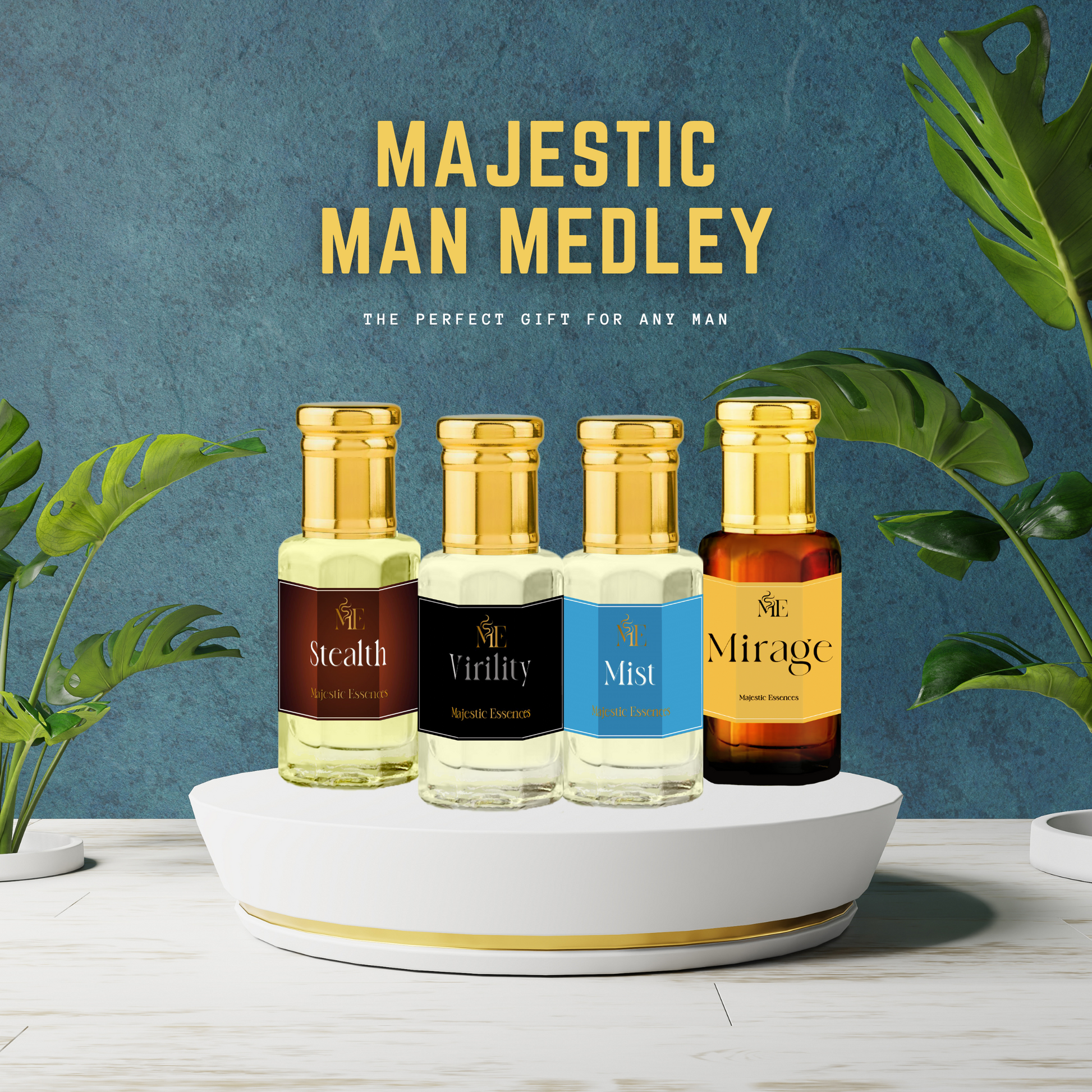 Introducing the Majestic Man Medley, a captivating gift set of 4 top men's fragrance oils - Virility, Mirage, Stealth & Mist. This gift set is perfect for the upcoming season as it makes a thoughtful present for any important man in your life or even as a well-deserved treat for yourself.
